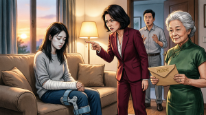 When we got home, she climbed the stairs ahead of me without once looking back. Each step felt like a mountain. My cast bumped the edge of a riser; pain shot up my body. I gripped the railing, teeth gritted, curious if she could hear me struggle and was choosing not to care.